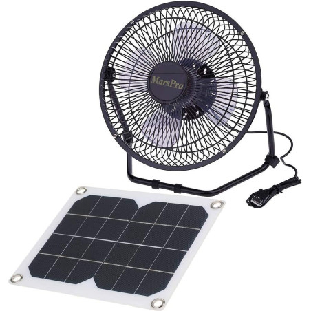 The solar panel conversion rate will be affected by the weather conditions, so please make sure the panel is placed in bright place with direct sunlight. And the power of fan depends on the solar panel.